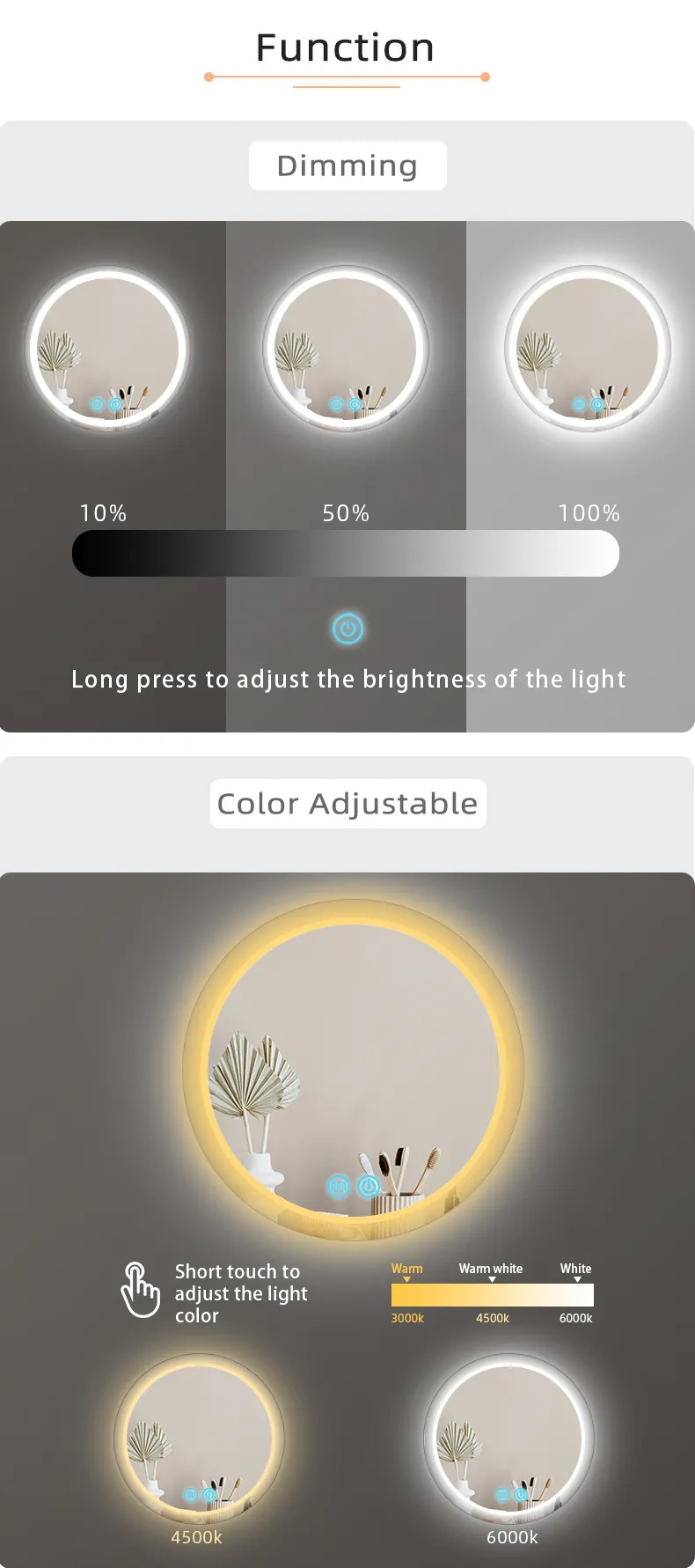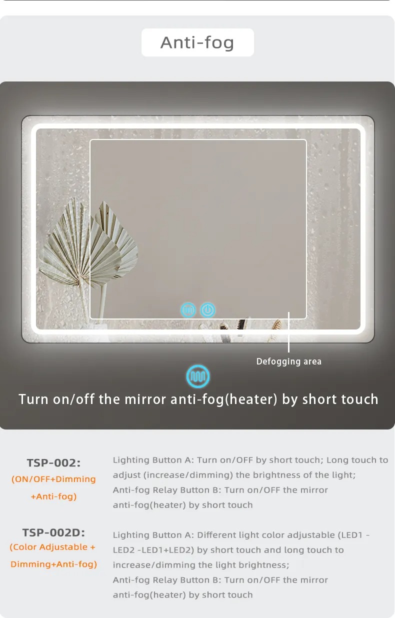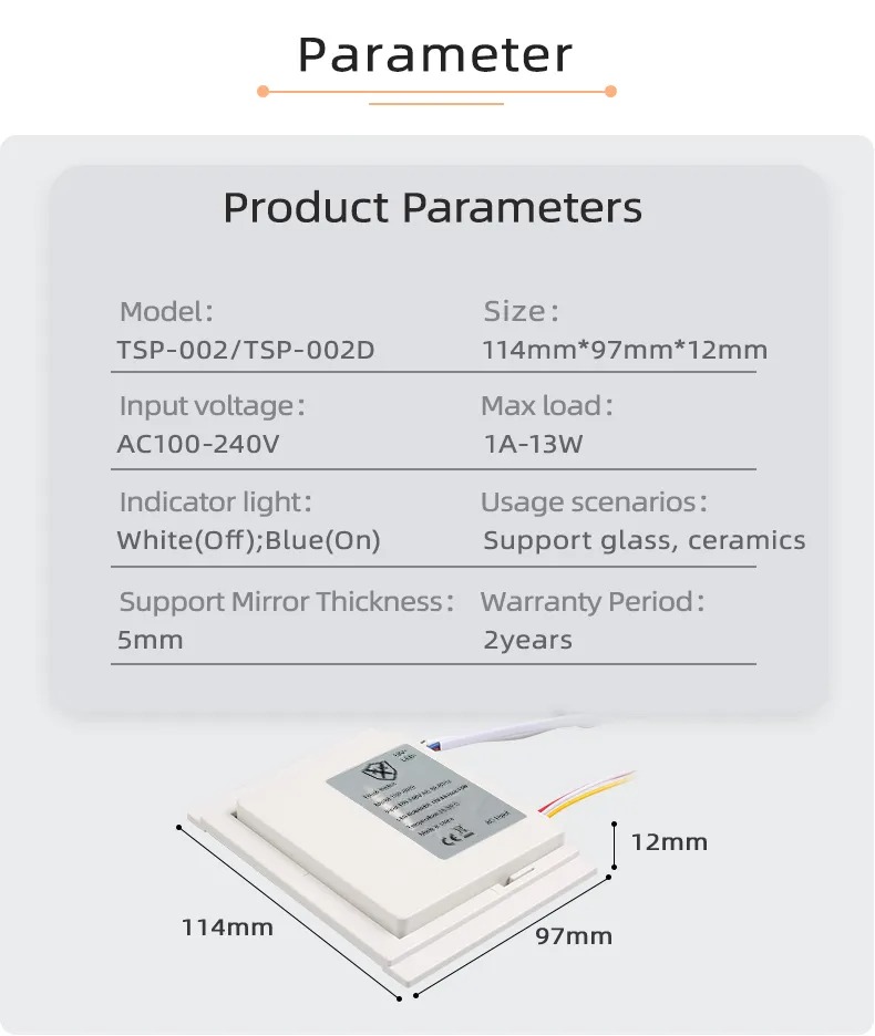 The Mirror Touch Switch with Internal LED Power Supply(LED Driver/LED Transformer) is a smart switch specially designed for all kinds of bathroom smart light mirrors, bathroom anti-fog light mirrors, LED light mirrors, mirror cabinets and other products,
