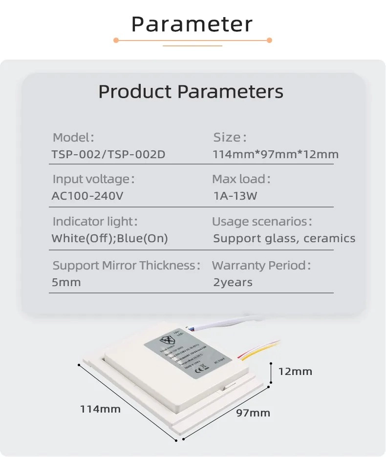 The Mirror Touch Switch with Internal LED Power Supply(LED Driver/LED Transformer) is a smart switch specially designed for all kinds of bathroom smart light mirrors, bathroom anti-fog light mirrors, LED light mirrors, mirror cabinets and other products,